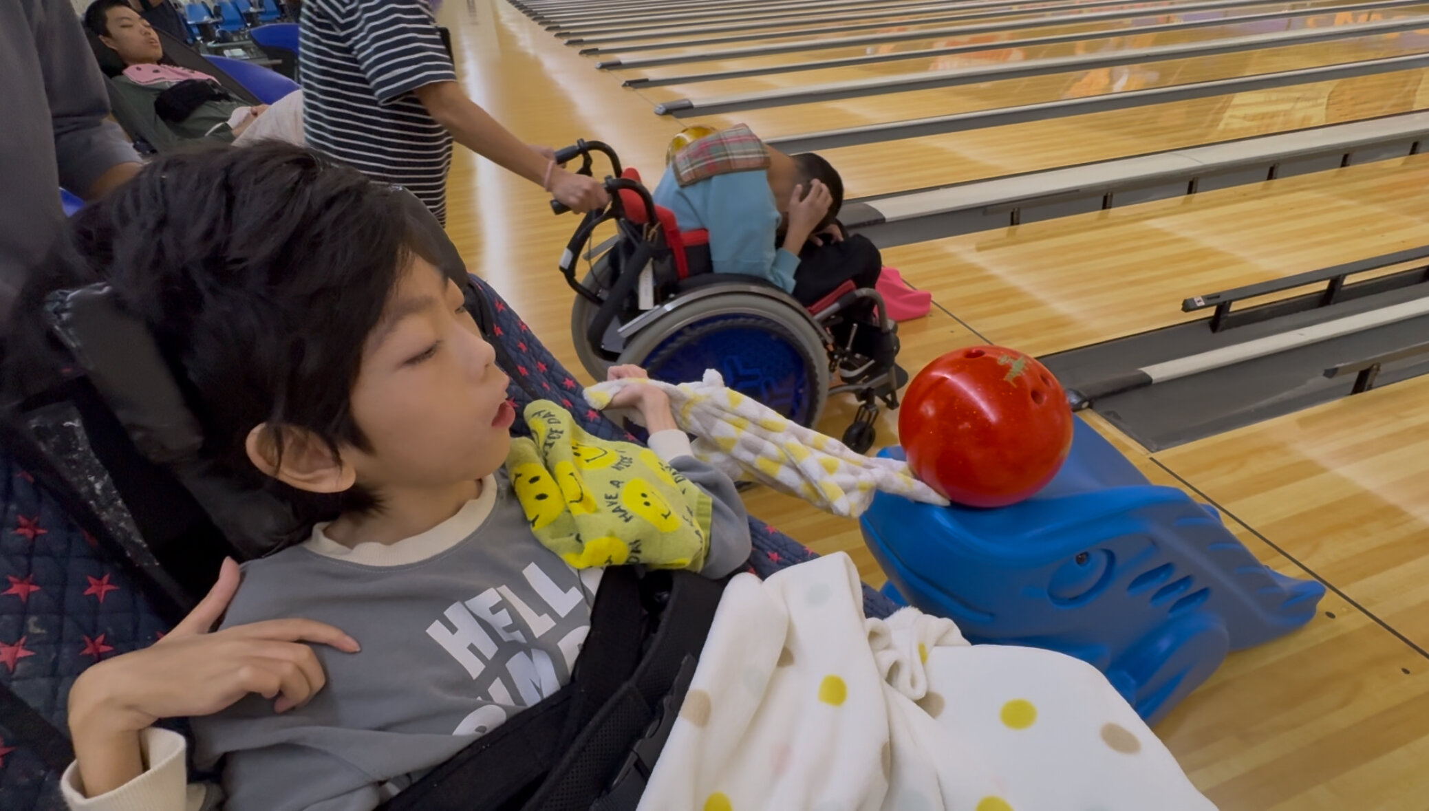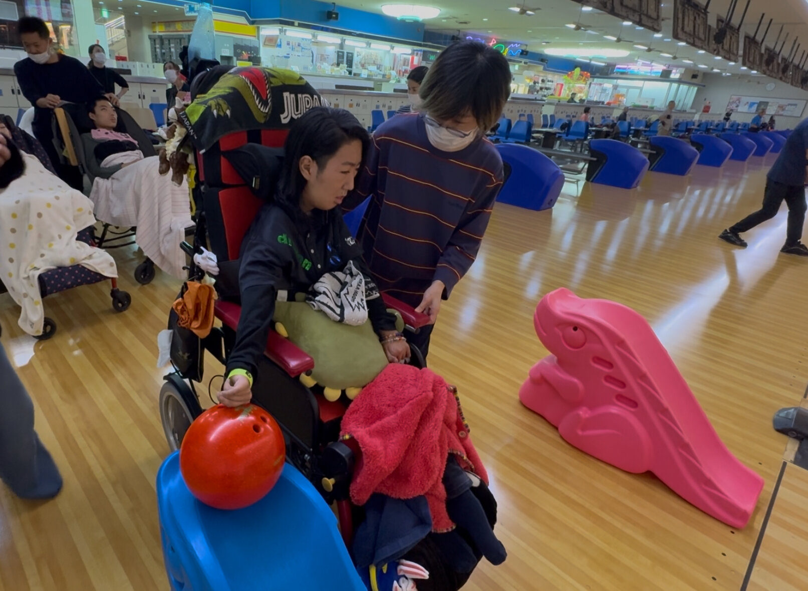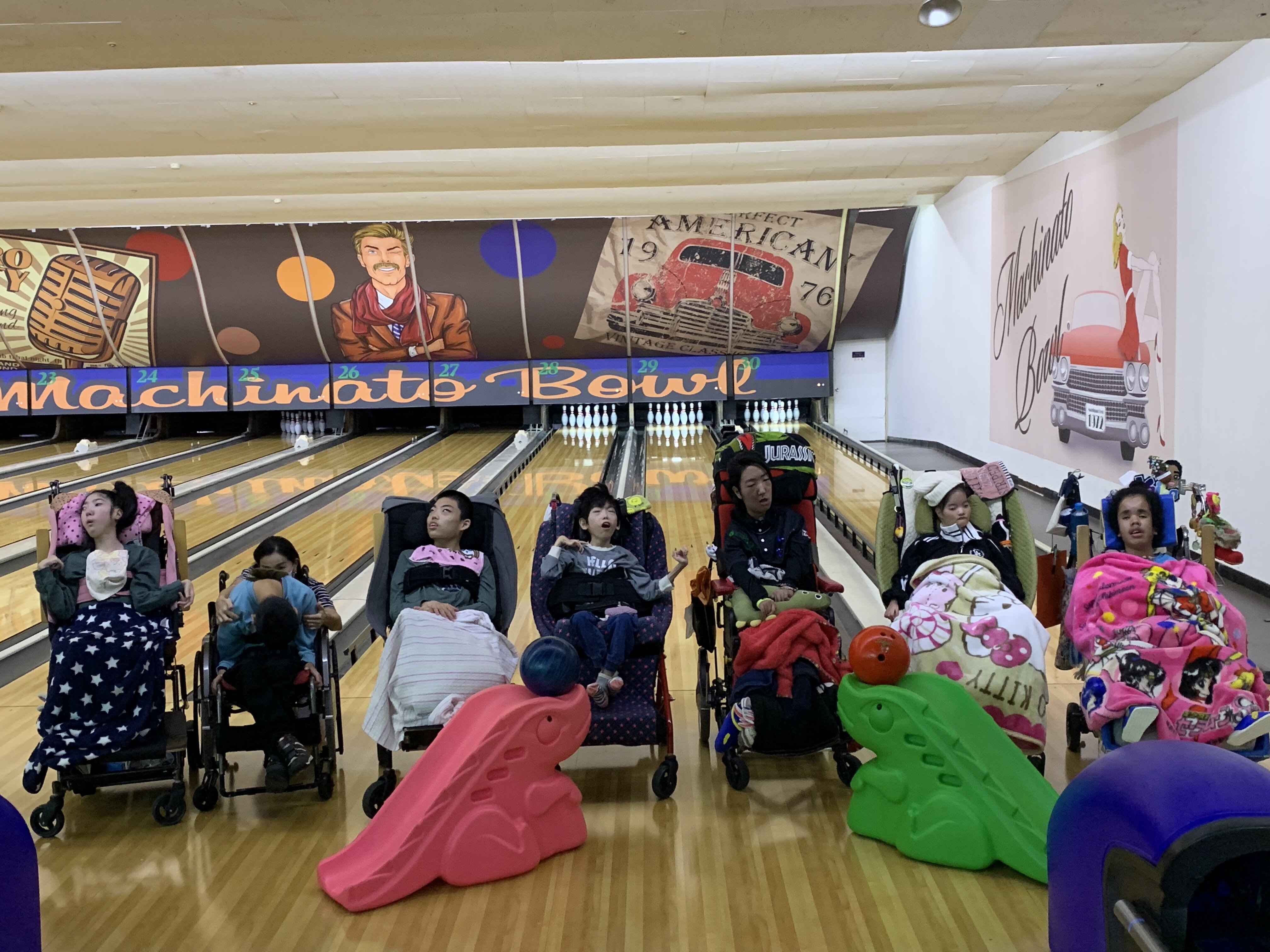 医療的ケアが必要な生徒もいる中で、安全に配慮しながら活動を行いました。体育の授業で挑戦してきたボウリングを、実際のボウリング場で体験することで、より本格的な雰囲気を味わうことができました。大きな音にも萎縮することなく、支援具を活用して自らピンを倒し、ゲームに参加する姿が見られました。担任の先生と順番を待ちながら応援するなど、ゲームの雰囲気を感じながら楽しむことができました。ピンが倒れるたびに歓声が上がり、笑顔が見られるなど、白熱した戦いが繰り広げられました。![]()