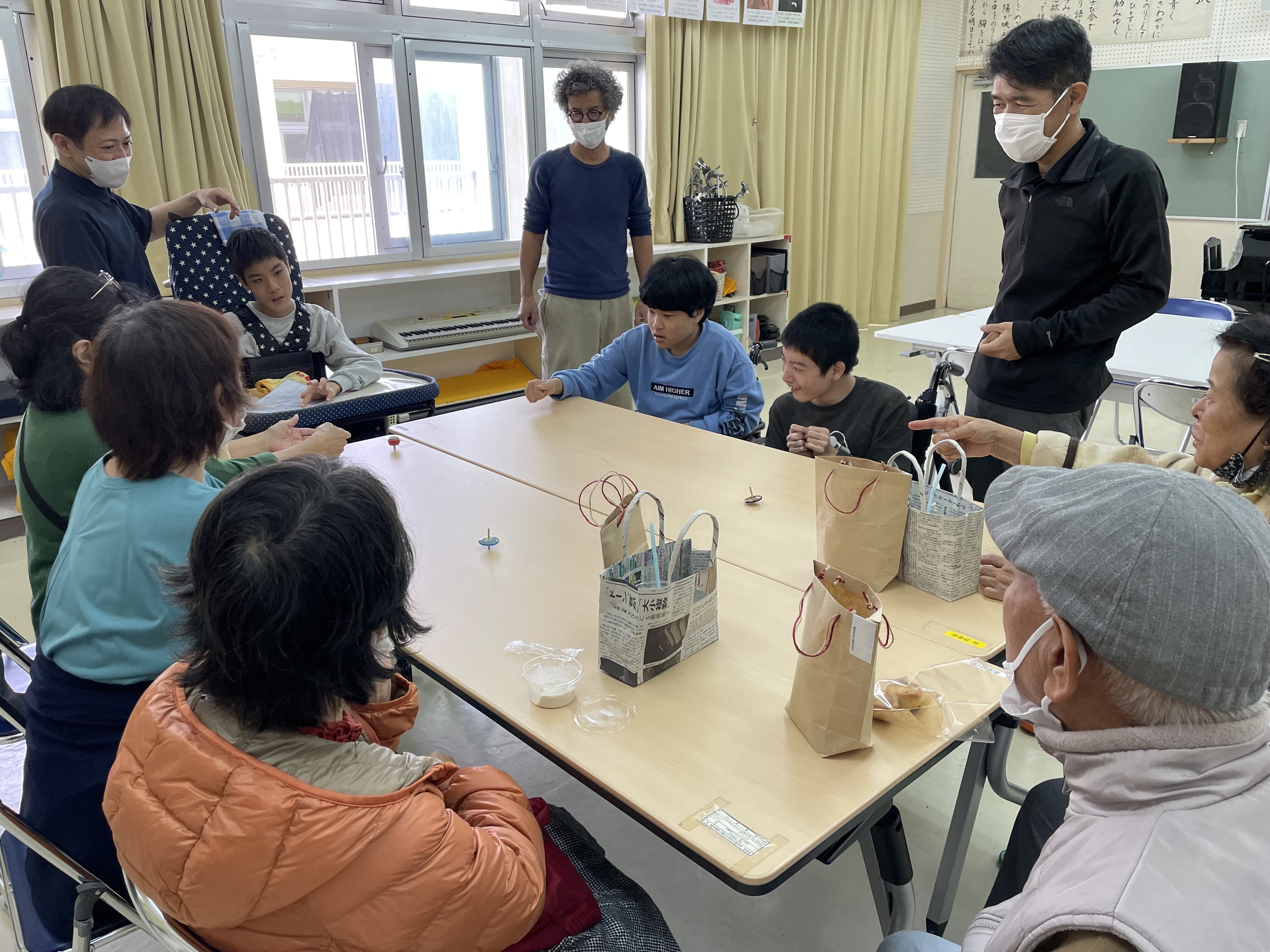 購入いただいた方には、続いて2組が担当するイートインスペースでくつろいでいただきました。2組の生徒たちは、こま回し体験やどっちどっちゲーム、肩たたきのサービス、おしゃべりなど、思い思いのおもてなしでお迎えしました。笑い声が響き、自然と会話が弾む、あたたかい雰囲気に包まれたひとときとなりました。