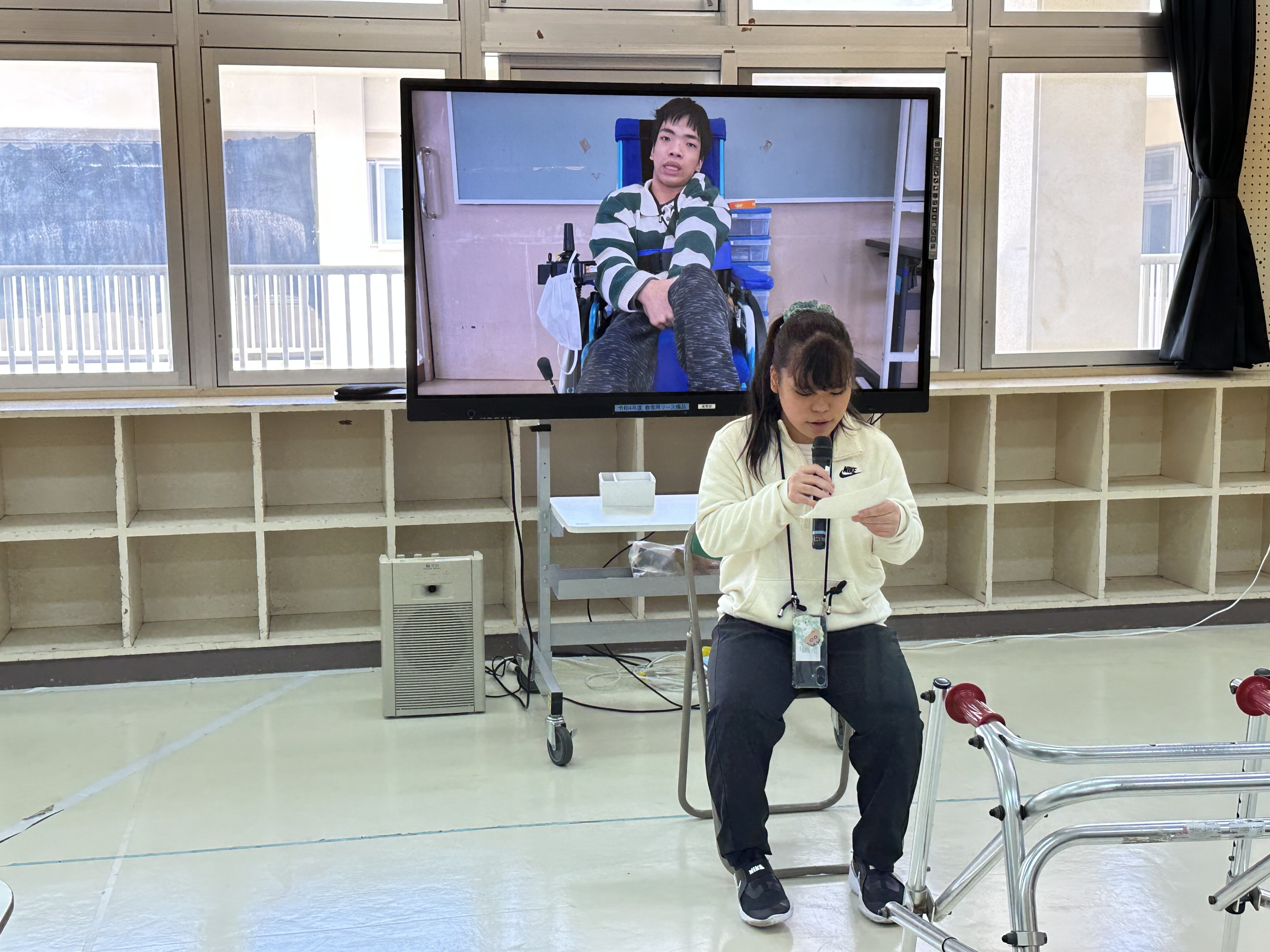 7月10日(木)、中学部1組・高等部1組の生徒と、全学部の保護者の皆様を対象に進路講話を開催しました。今回の講師は、合同会社たいたい代表であり、名護市で訪問介護事業所を運営されている金城太亮(きんじょう たいすけ)さんです。金城さんは、脊髄性筋萎縮症という難病を抱えながらも、パラグライダーに挑戦したり、湘南の風のライブに参加したりと、数々のチャレンジを重ねてこられた方です。